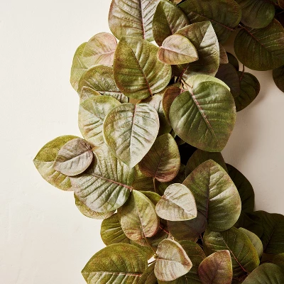 Add a natural look to your indoor space with this Faux Fall Leaf Wreath from Hearth & Handâ„¢ with Magnolia. Featuring faux eucalyptus leaves that have realistic green coloring and detailing, this round wreath has a simple and clean design that pairs seamlessly with a variety of different decor styles. This faux wreath also has a lightweight design that makes it easy to hang and display for a crisp touch of greenery.