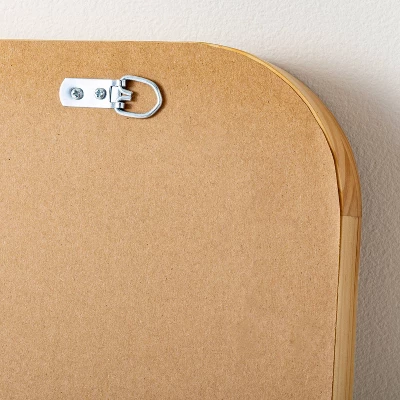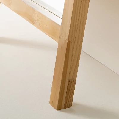 Make any room look more spacious with this 71″ Standing Wood Framed Mirror Natural from Hearth & Handâ„¢ with Magnolia. This rectangular standing mirror brings decorative style and function to your indoor space. It features a deep wood frame for dimensional style. The recessed glass center creates the illusion of extra space, while the natural color coordinates easily with existing decor. This full-length mirror comes with anti-tip anchoring hardware for easy hanging.