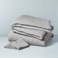 Refresh your sleeping nook with this Cream/Railroad Gray Cotton Percale Thin Stripe Sheet Set from Hearth & Handâ„¢ with Magnolia. This percale bed sheet set includes two pillowcases, one flat sheet and one fitted sheet for a coordinated look. Each of the pieces feature chic, thin railroad stripes on a cream backdrop to bring a classic look to your bedroom decor. The soft, breathable cotton fabric ensures a comfortable night’s sleep, and it can be simply machine washed for easy care. Pair with your choice of comforter or quilt and some throw pillows for a warm and inviting bedroom setting.