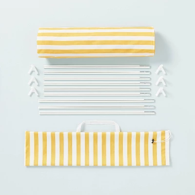 Keep your kiddo’s outdoor playtime fun and exciting with this Stargazing Play Tent from Hearth & Handâ„¢ with Magnolia. Set on a fiberglass frame, this playhouse is designed as a play tent and showcases a white and yellow stripe pattern. Featuring a large entrance at the front with ties to give the option of leaving it open or closed, the stargazing tent offers them a soft spot for sitting comfort.