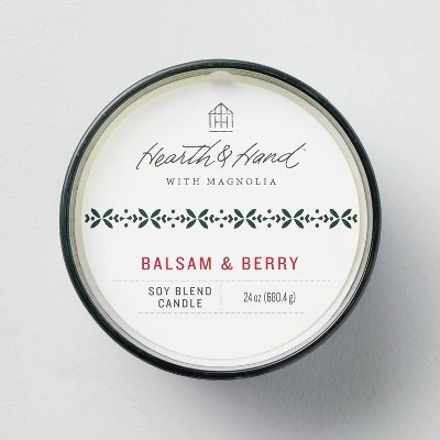 This Textured Glass Balsam and Berry Jar Christmas Candle from Hearth & Handâ„¢ with Magnolia will help you create a relaxing, wintry ambiance in your home. This green jar candle is designed in a textured round bowl shape with a plaid pattern for an appealing look. Elegantly made with glass, this scented jar candle features a mix of balsam and berry scents to create a rejuvenating vibe. Designed with a burn time of around 28 hours, this four-wick jar candle can be used in both indoor and sheltered outdoor spaces.
